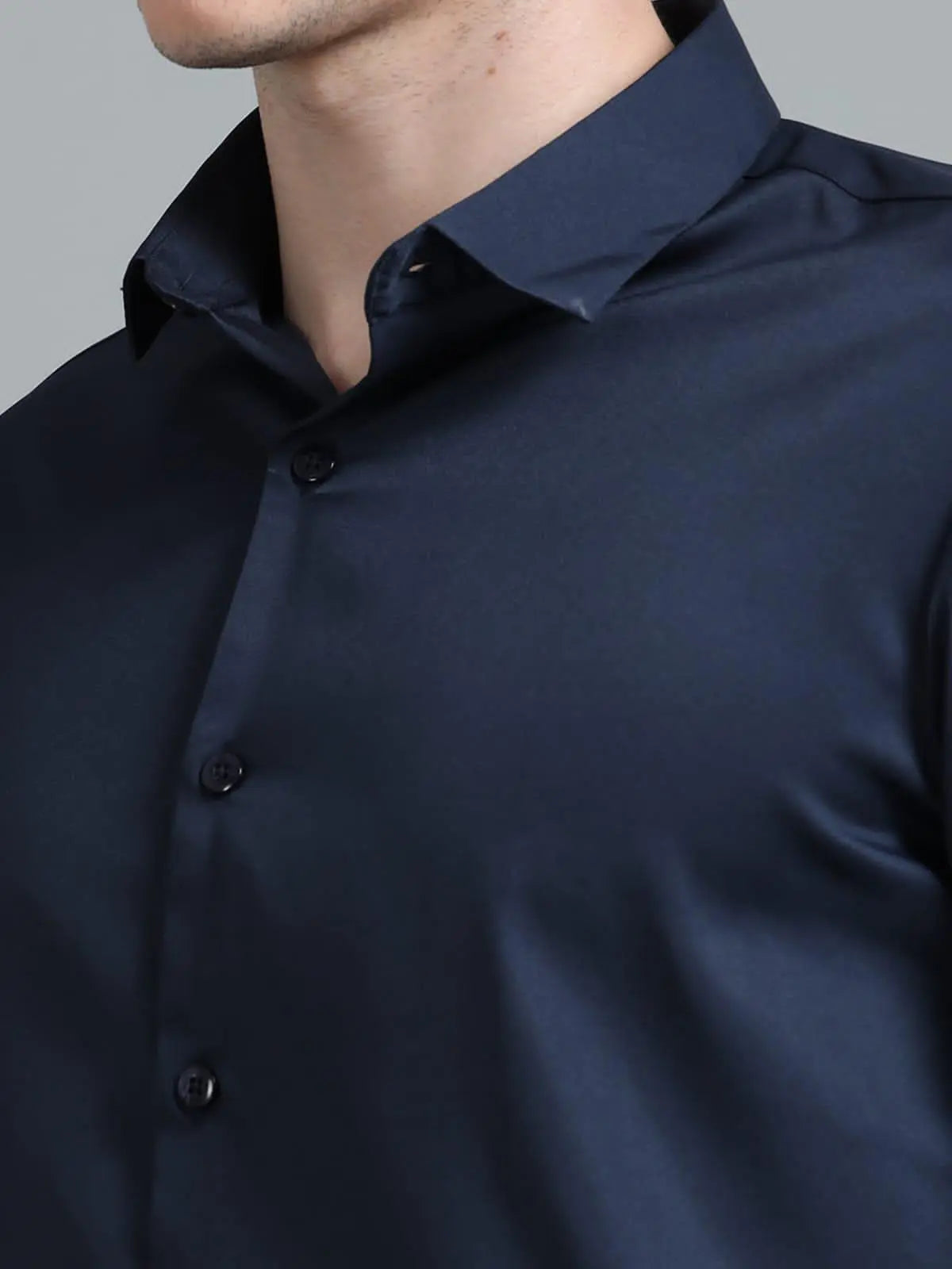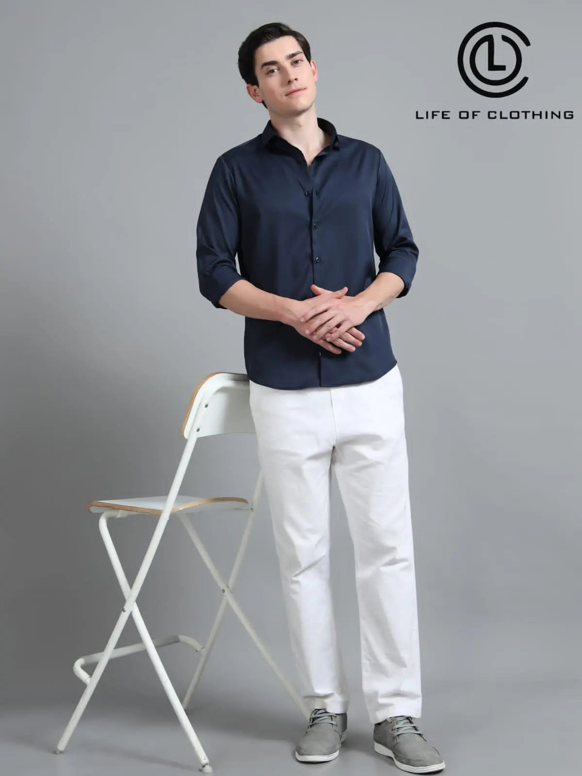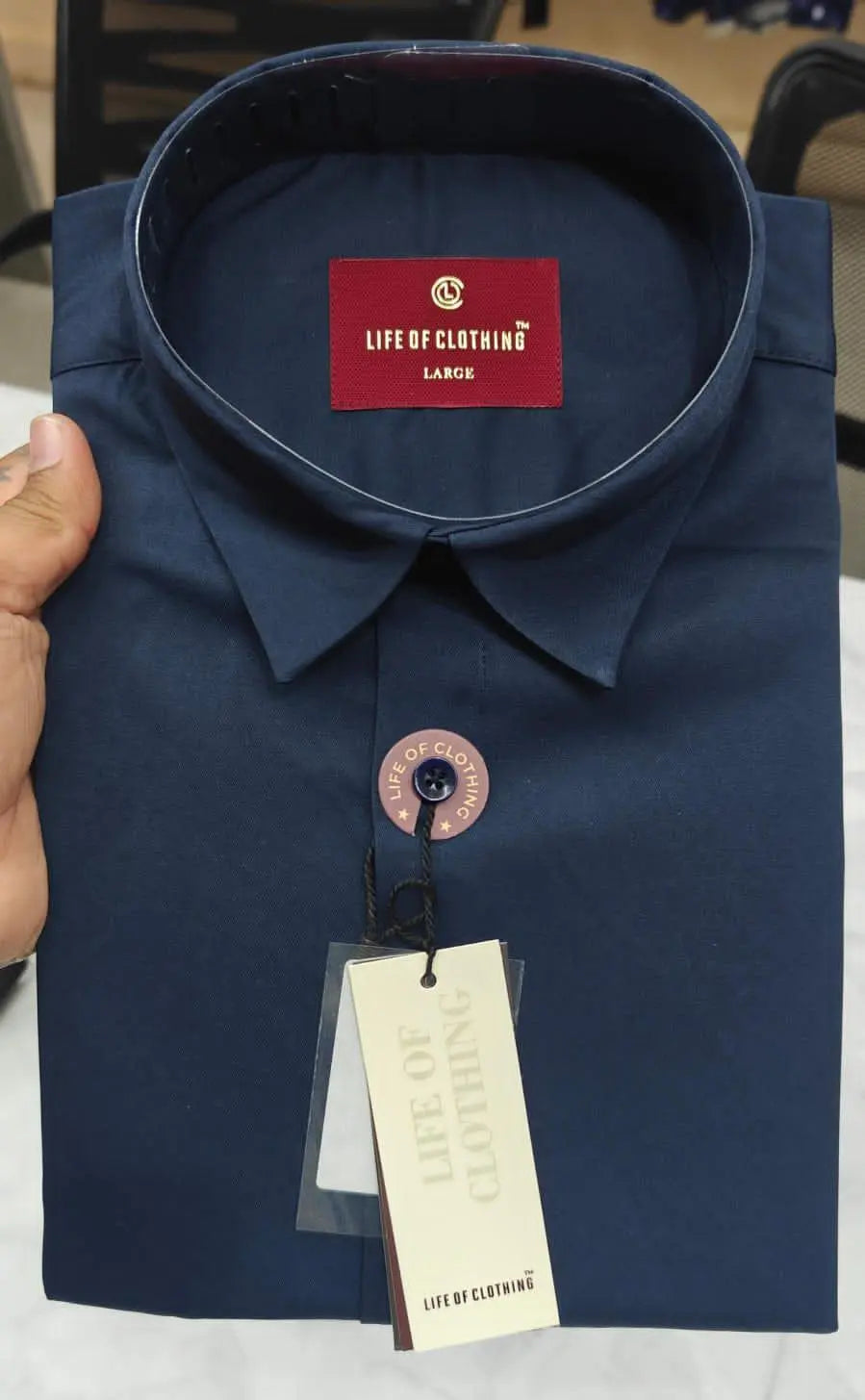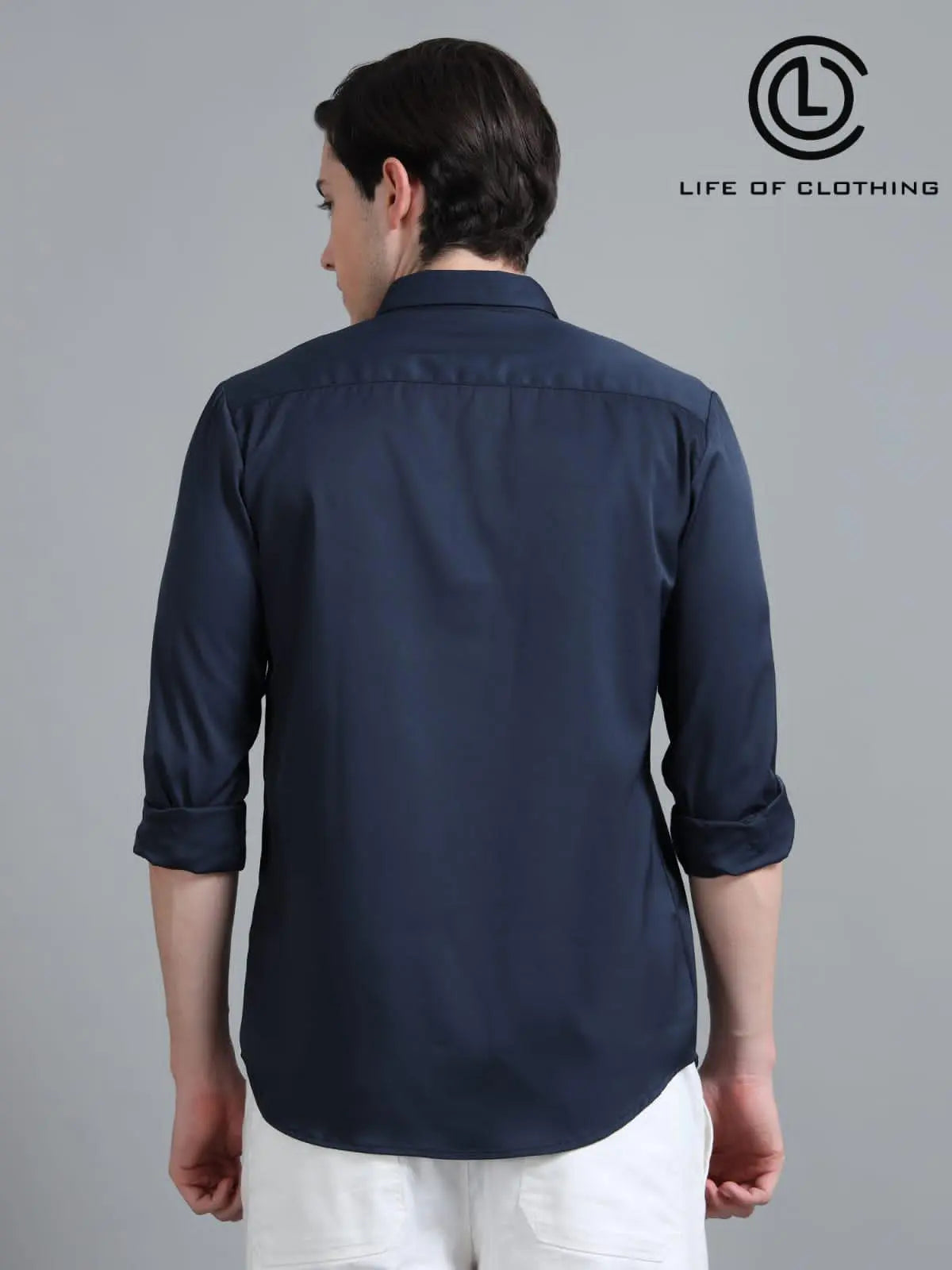 Elevate your wardrobe with the sophisticated Navy Blue Satin Korean Lycra Shirt from Life of Clothing. Designed for both formal... Read more